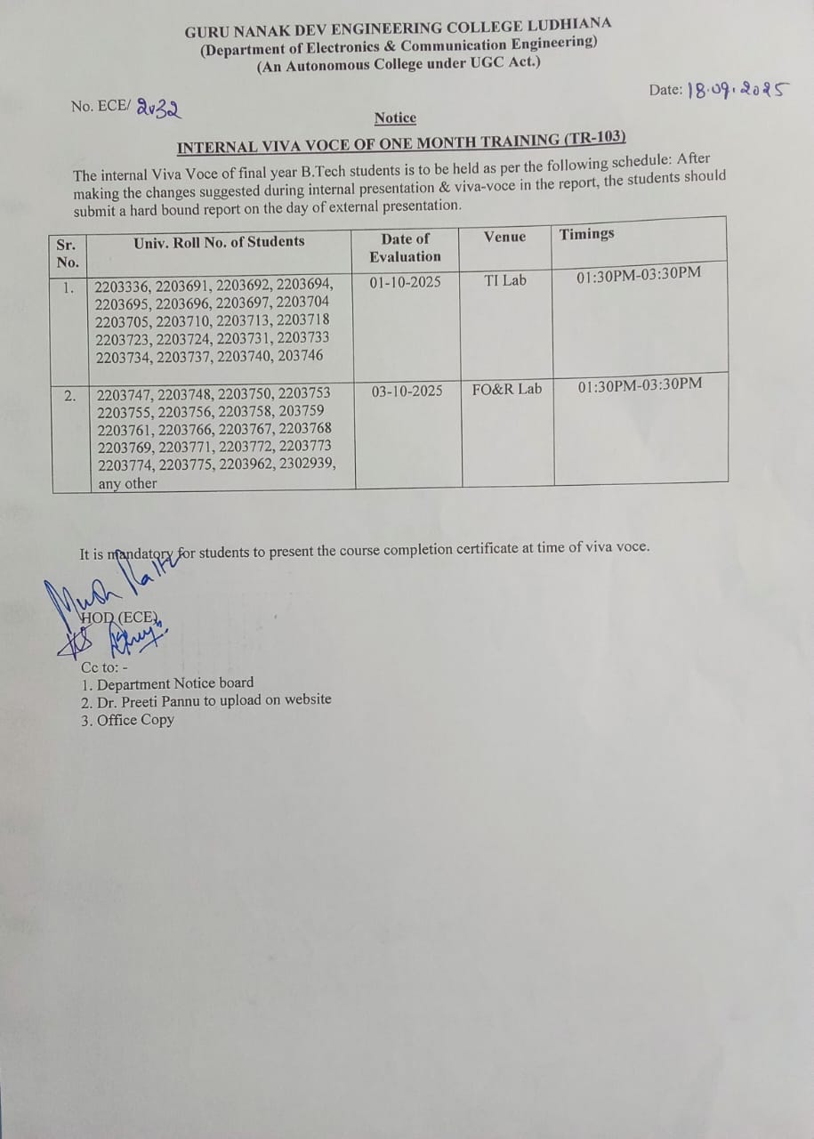 The Department of Electronics and Communication Engineering, established in 1981, is one of the most dynamic departments of Guru Nanak Dev Engineering College. It was the first major diversification initiative by the college, 25 years after its establishment. The department is currently running Bachelors and Masters of Technology courses in Electronics and Communication Engineering and has around 10 scholars enrolled for doctorate in areas like Antenna Design, VLSI, Optical communication etc. Ever since its inception, the department has been the hub of academic excellence through some great teachers who have laid a sound foundation as well as the cream of students of the region, who have spread their wings all over the globe. The alumni of the department are not only excelling in India but also in the Silicon Valley and other hubs of Electronics Technology. They are at the forefront of the Telecom revolution of the last 20 years and manning pivotal positions in Telecom operators in India, South East Asia, Pacific region and Africa.
